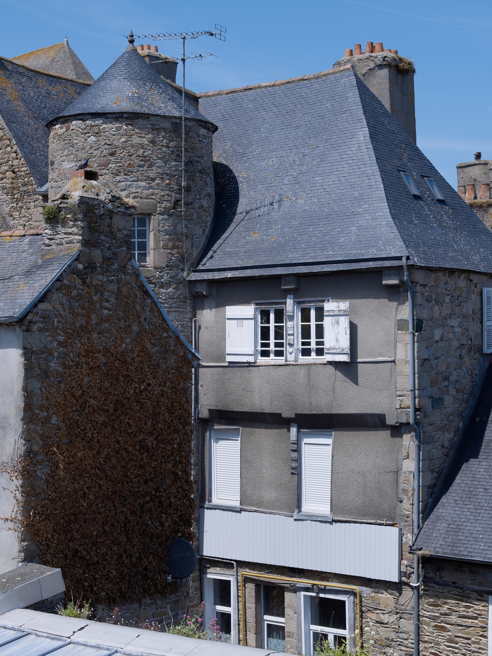 Vue arrière du 4 place du Martray. Tour d'escalier et corps de batîment postérieur à pans de bois recouvert d'enduit. Vue générale sud-estImmatriculation