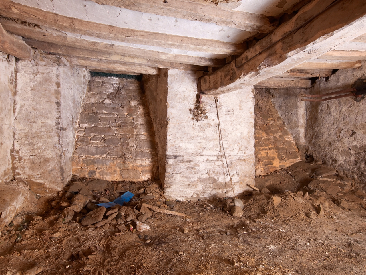 Tréguier, boulevard Anatole Le Braz : palais épiscopal aujourd'hui mairie et bibliothèque, sous-sol, détail de la poutraison et du plancher. Au fond de la pièce, soupirauxImmatriculation