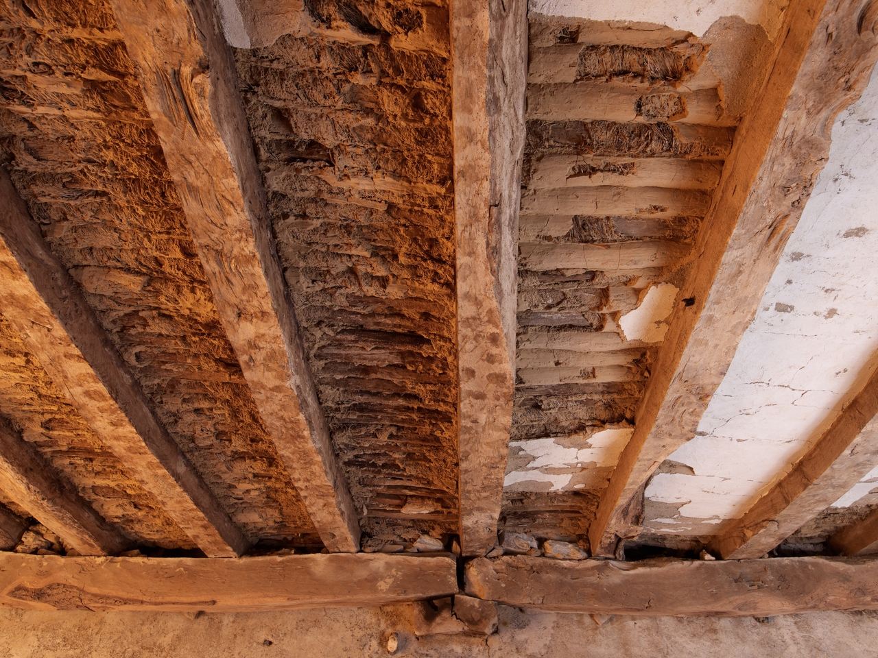 Tréguier, boulevard Anatole Le Braz : palais épiscopal aujourd'hui mairie et bibliothèque, sous-sol, détail de la poutraison et du plancher. Entre chaque solive afin d'isoler le plancher du sous-sol : remplissage avec des quenouilles (cylindres constitués de baguettes de châtaignier, de terre et de foin), enduites et blanchies au lait de chauxImmatriculation