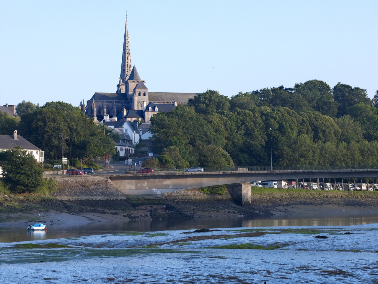 Tréguier : vue de la cathédrale saint-Tugdual depuis Plouguiel, front nord avec la Tour Hasting. Au premier plan : le Pont noir sur le GuindyImmatriculation