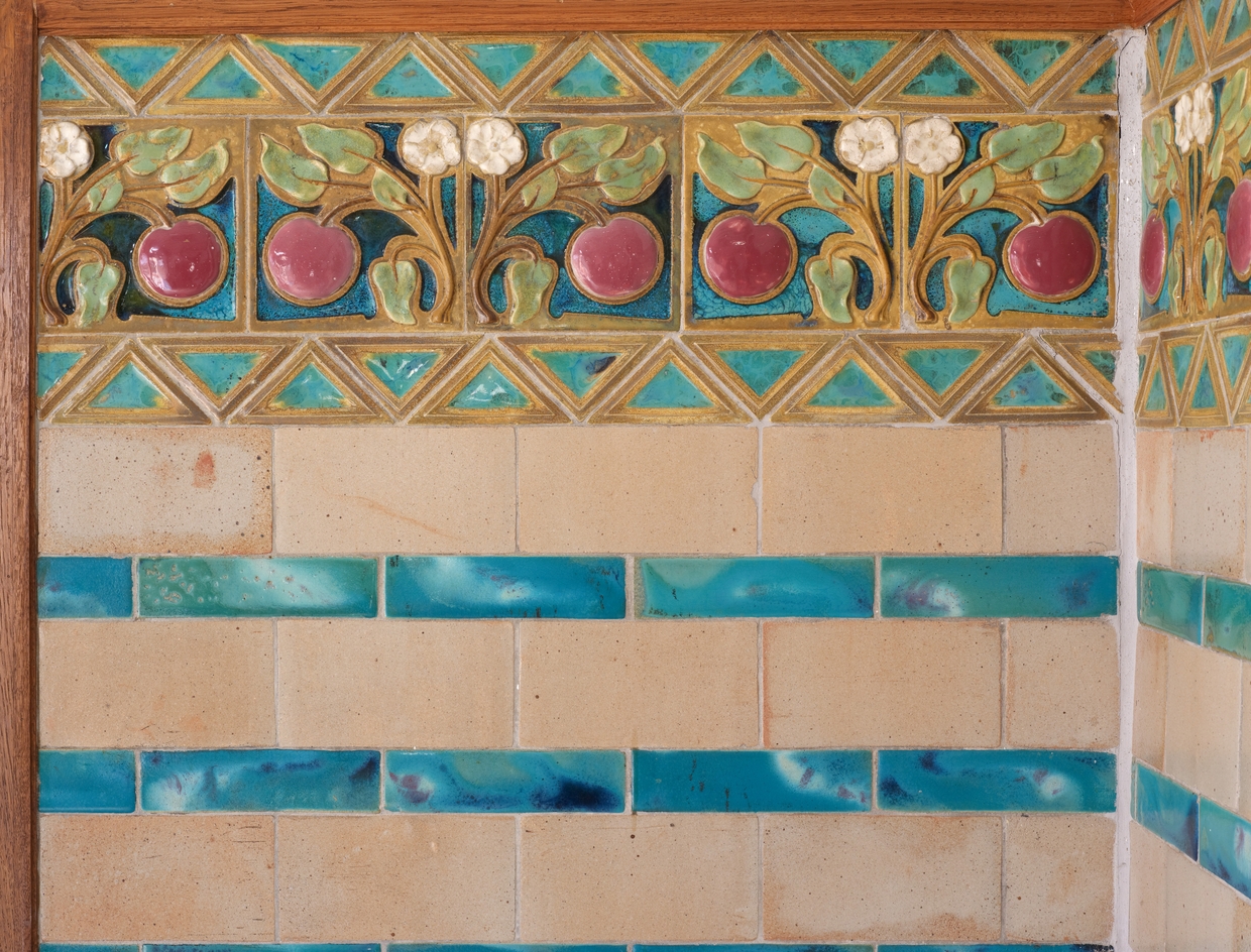 Jardin d'hiver. Détail d'un pan de mur en céramique de grès avec décor en relief de fleurs de cerisiers et de cerisesImmatriculation