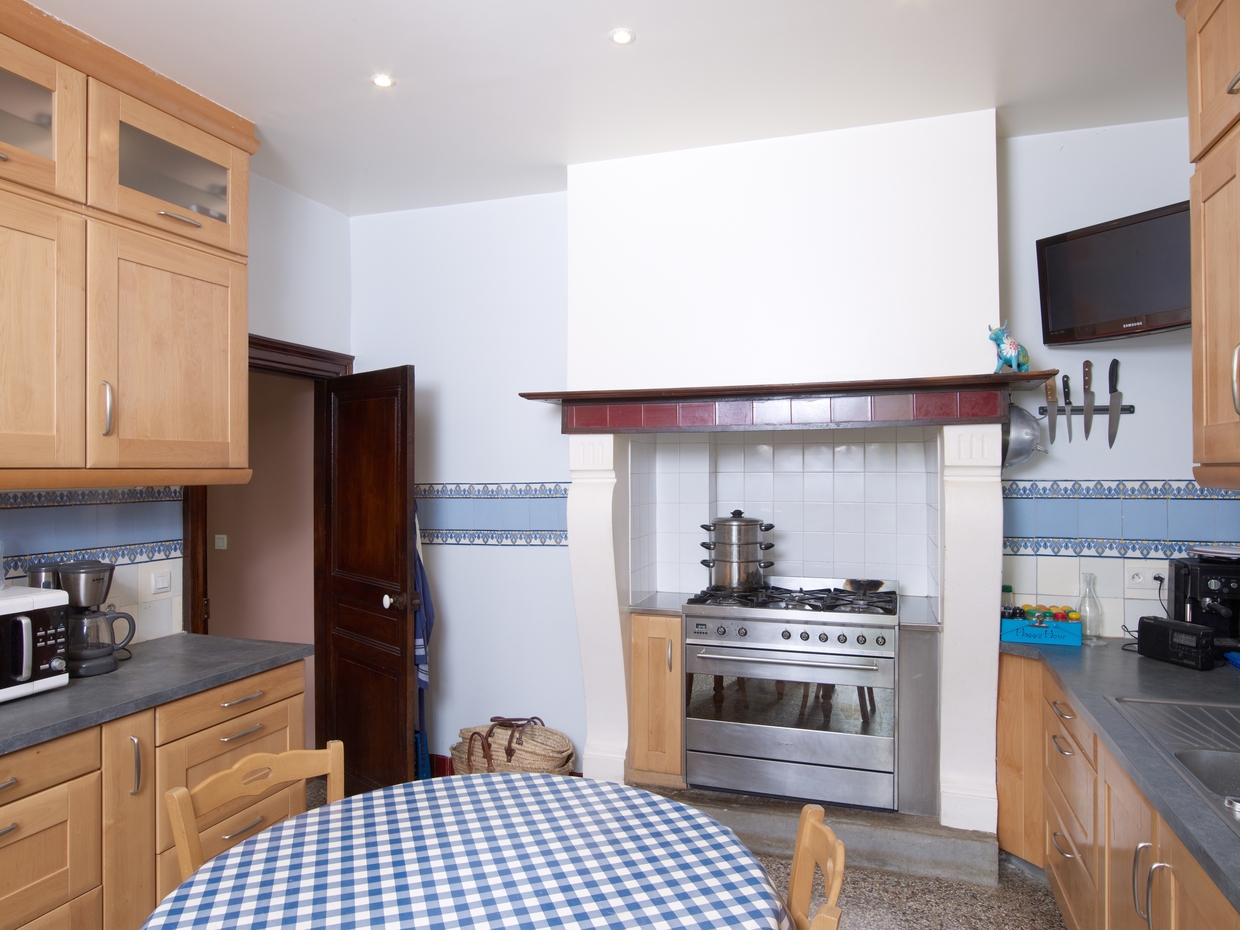 Cuisine. Murs habillés de carreaux de faïence bleu et rouge. Vue généraleImmatriculation