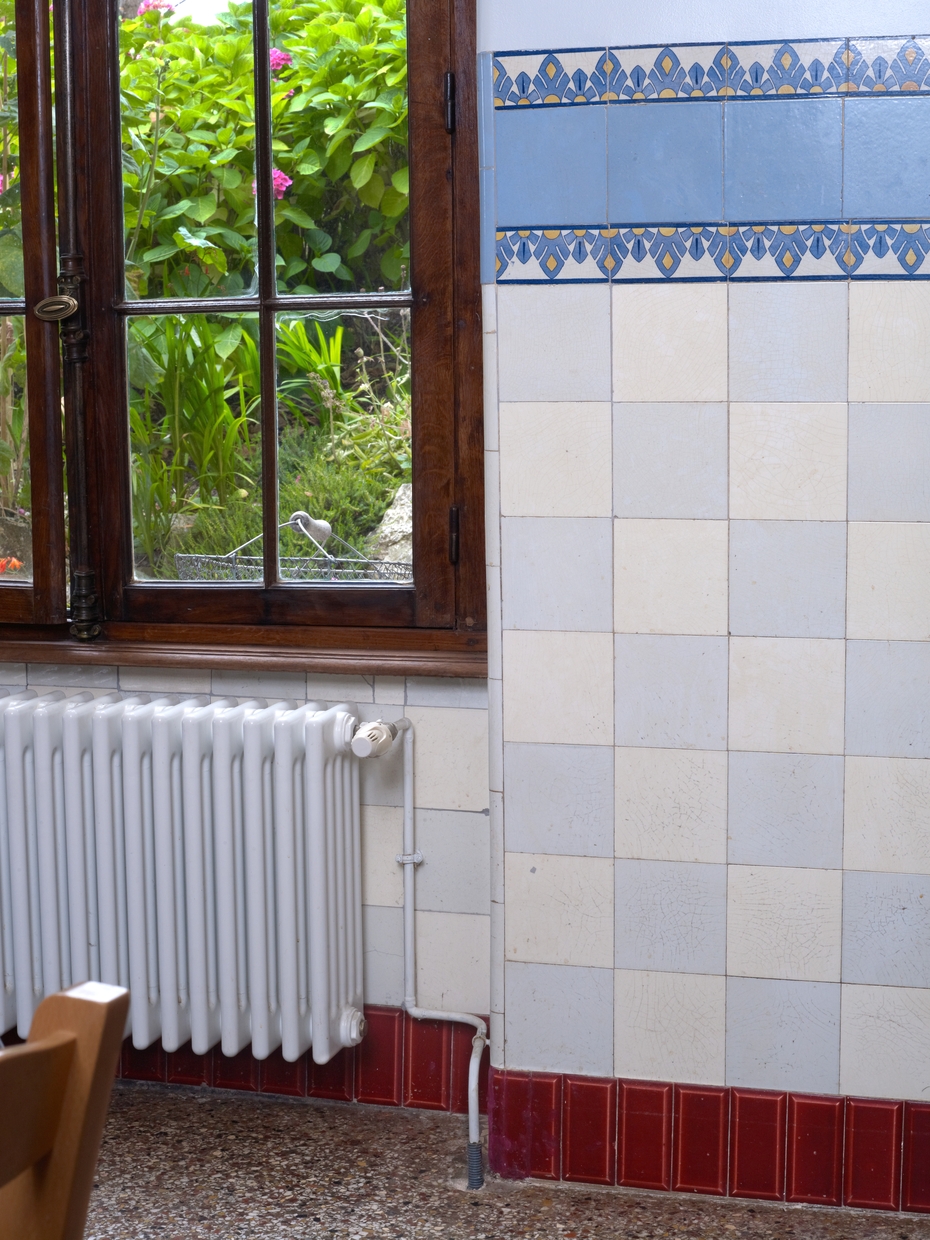 Cuisine. Détail d'un pan de mur habillé de carreaux de faïenceImmatriculation