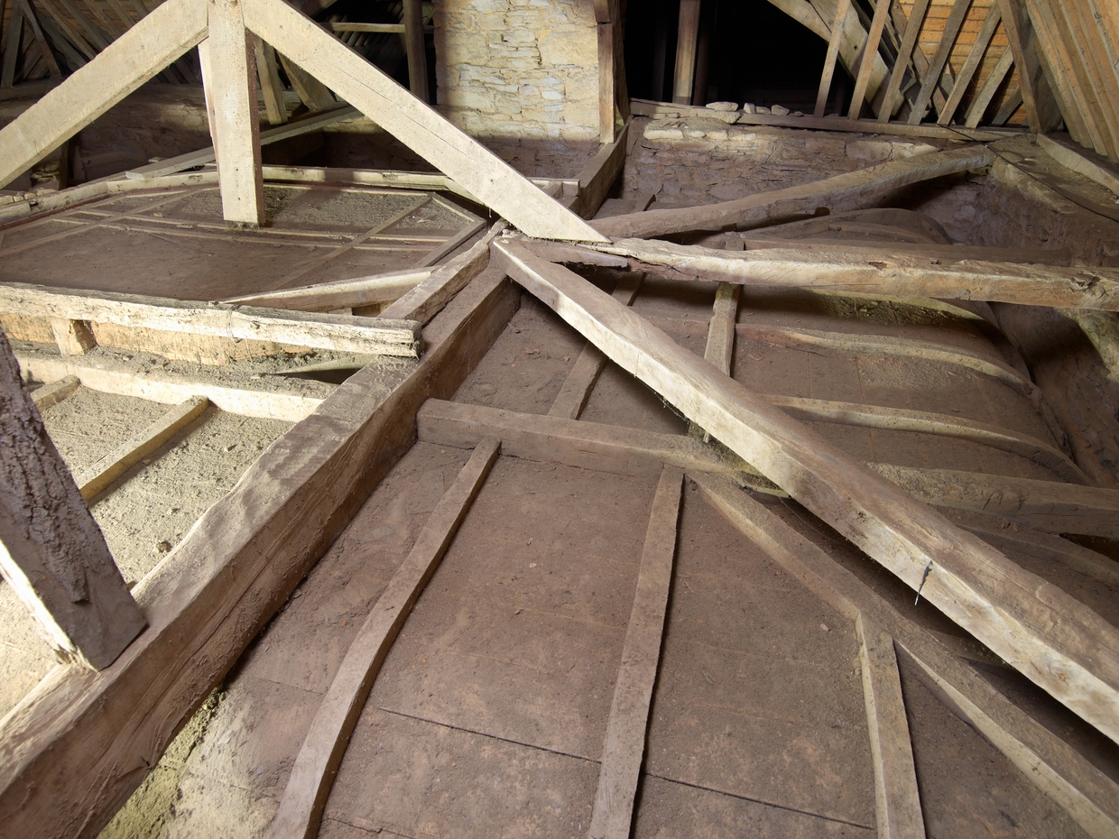 Tréguier, boulevard Anatole Le Braz : palais épiscopal aujourd'hui mairie et bibliothèque, corps principal, vestibule et escalier d'honneur, lambris du plafond depuis les comblesImmatriculation