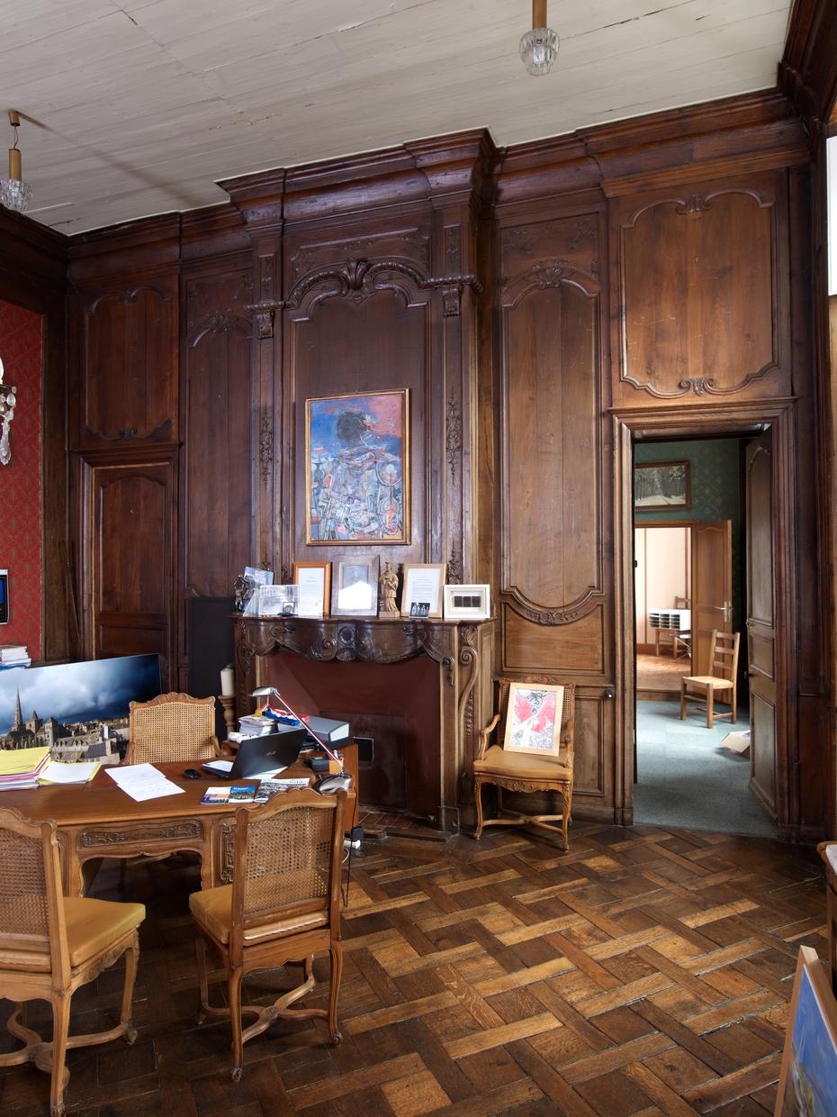 Tréguier, boulevard Anatole Le Braz : palais épiscopal aujourd'hui mairie et bibliothèque, aile nord-ouest, premier étage, pièce avec cheminée et boiseries (actuel bureau du maire)Immatriculation