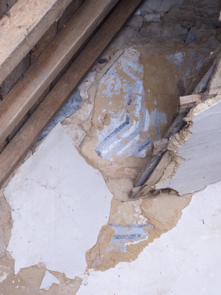 Tréguier, boulevard Anatole Le Braz : palais épiscopal aujourd'hui mairie et bibliothèque, aile sud-est, étage de comble, décor peint au-dessus du plafond en lattisImmatriculation