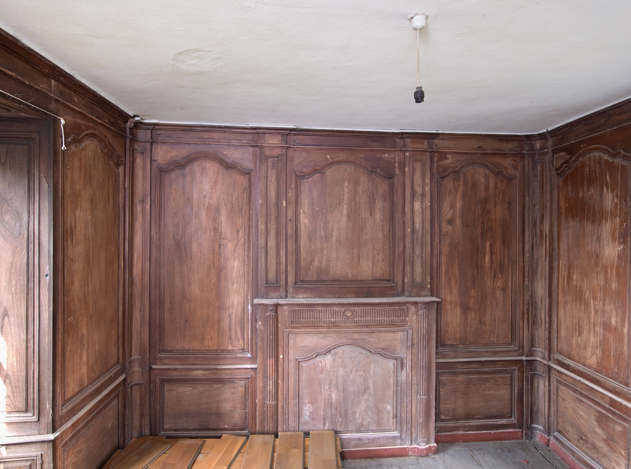 Tréguier, 20 et 22 rue Colvestre : pavillon de jardin ou "gloriette", vue intérieure, pièce avec cheminée et boiseriesImmatriculation