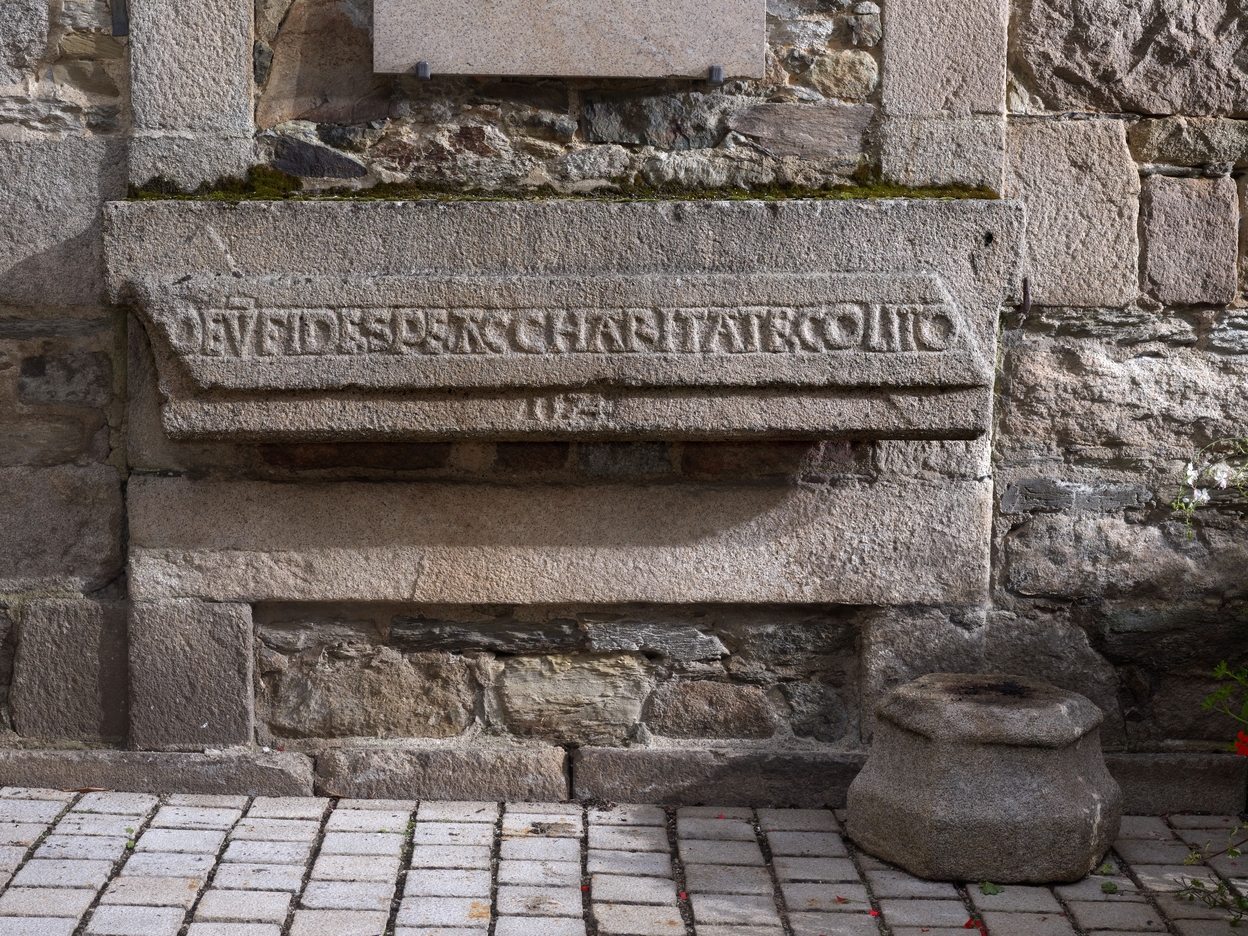 Tréguier, boulevard Anatole Le Braz : linteau de cheminée située contre la façade sud du pavillon ouest du plais épiscopal aujourd'hui mairie et bibliothèque. On peut lire l'inscription suivante : "DEV [DEUM] FIDE. SPE AC CHARITATE COLITO (Honore Dieu par la foi, l’espérance et la charité)" et le millésime 1574. Au pied, base de colonne en graniteImmatriculation