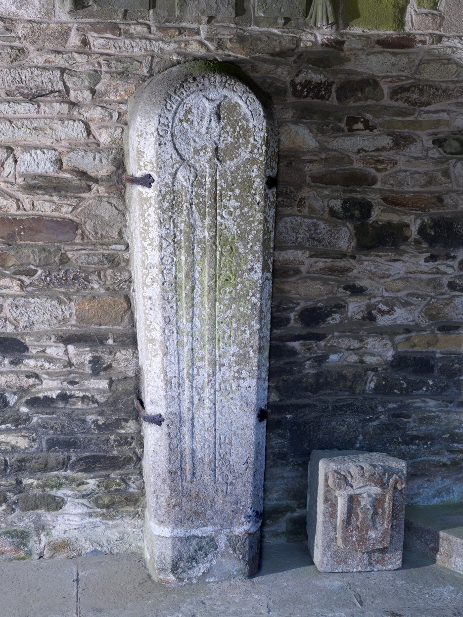 Tréguier : cloître de la cathédrale, pierre tombale, XIVe siècle (?) et pierre armoriéeImmatriculation