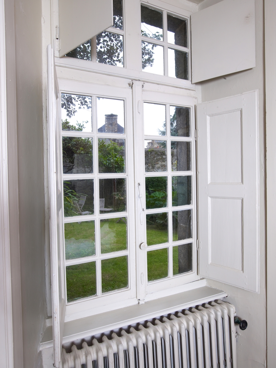 Tréguier, 11 rue du Port : maison d'armateur ou de négociant, premier étage, pièce côté jardin, fenêtre à petit bois d’origine à volet intérieur. A signaler, l'intéressant système de serrurerie avec crémone à basculeImmatriculation