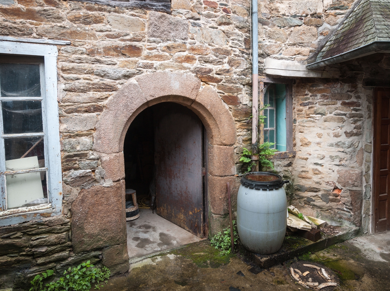 Tréguier, 15 rue Colvestre : maison à pan de bois rouge, aile sud sur cour, porte en arc plein cintre (2e moitié 16e siècle)Immatriculation