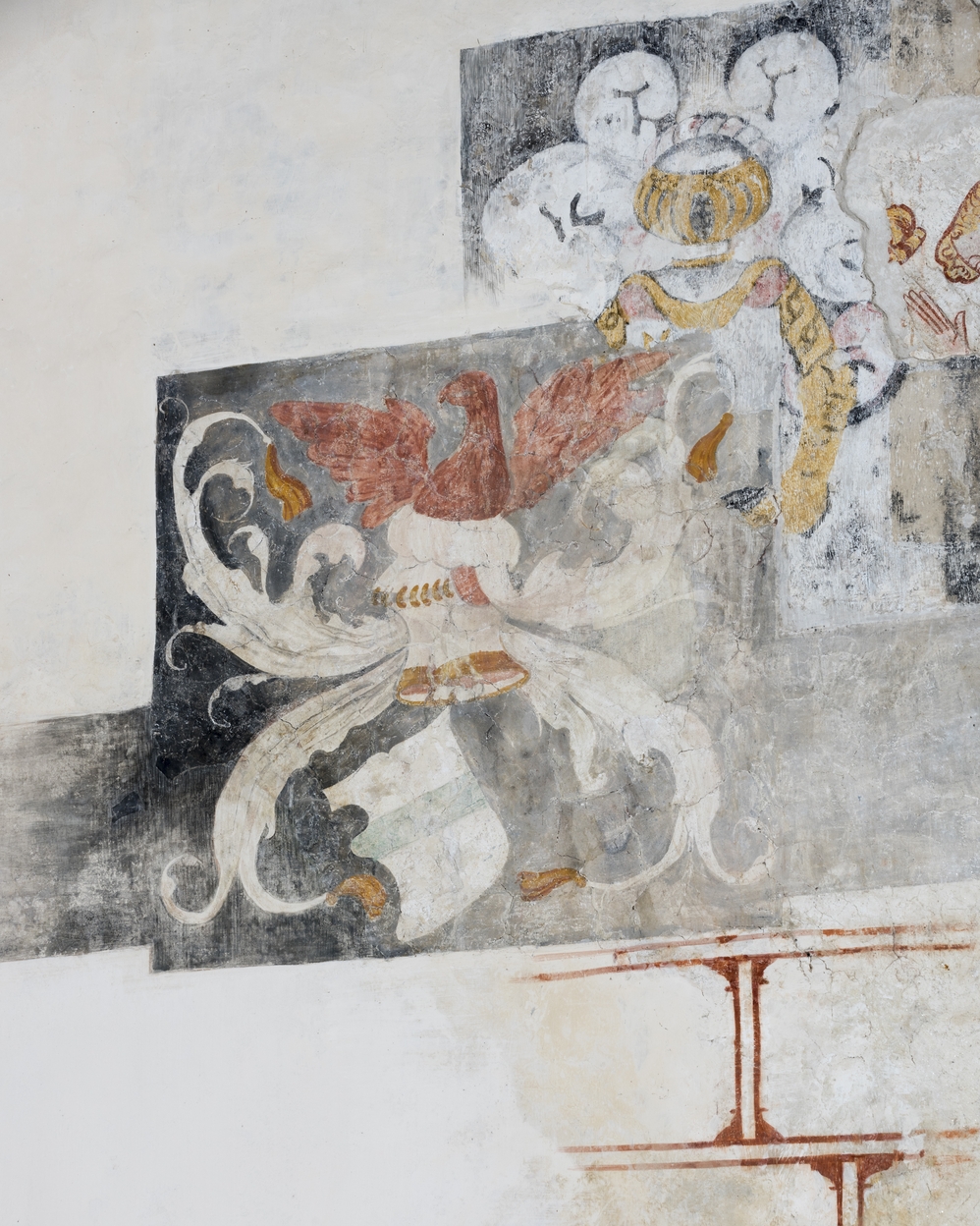Chevet, vue intérieure, décor peint, à gauche de la baie. litre seigneuriale, armes des FerréImmatriculation