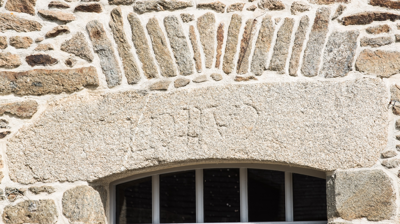 Partie droite du logis, détail du linteau de porte avec inscription retournéeImmatriculation