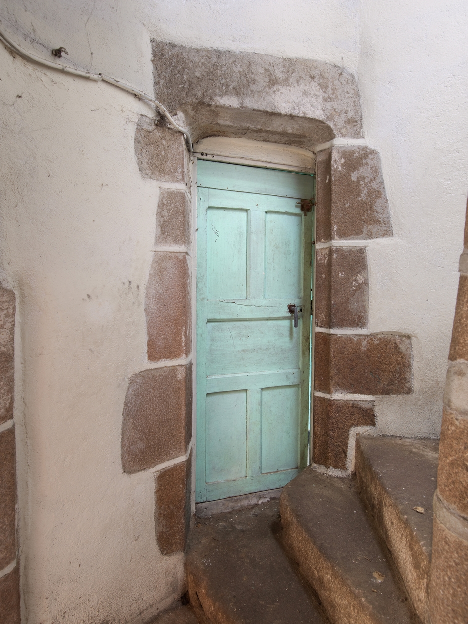 Tréguier, 15 rue Colvestre : maison à pan de bois rouge, tour d'escalier, escalier en vis et porte du palier (donnant sur l'aile sud)Immatriculation