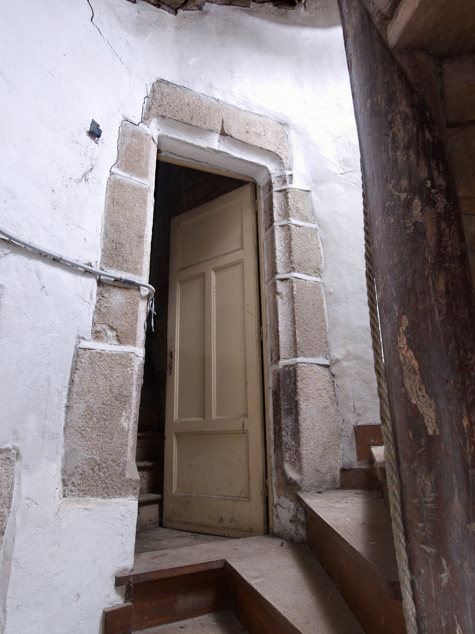 Tréguier, 15 rue Colvestre : maison à pan de bois rouge, tour d'escalier, escalier en vis et porte du palier à accolade (donnant sur l'aile sud)Immatriculation