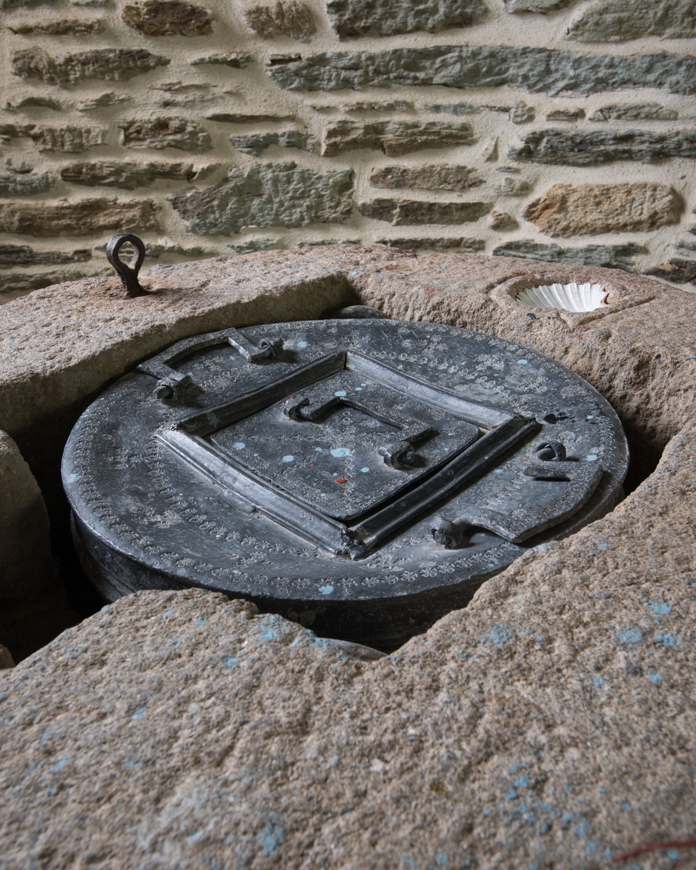 L'église. Chapelle des fonts. Les fonts baptimaux. Détail de la cuve en plomb du 17e siècleImmatriculation