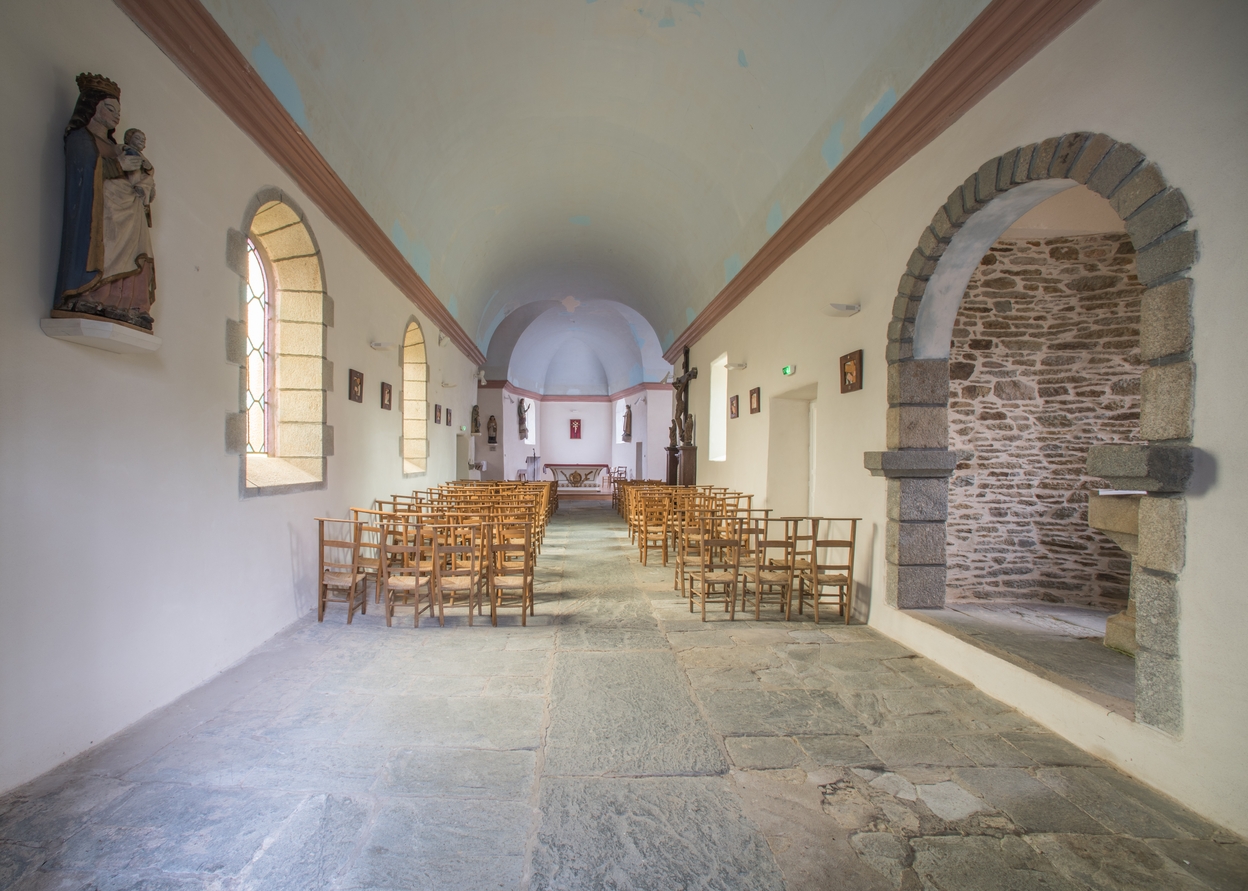 L'église. Vue générale intérieure vers l'est avec fonts baptismaux à droiteImmatriculation