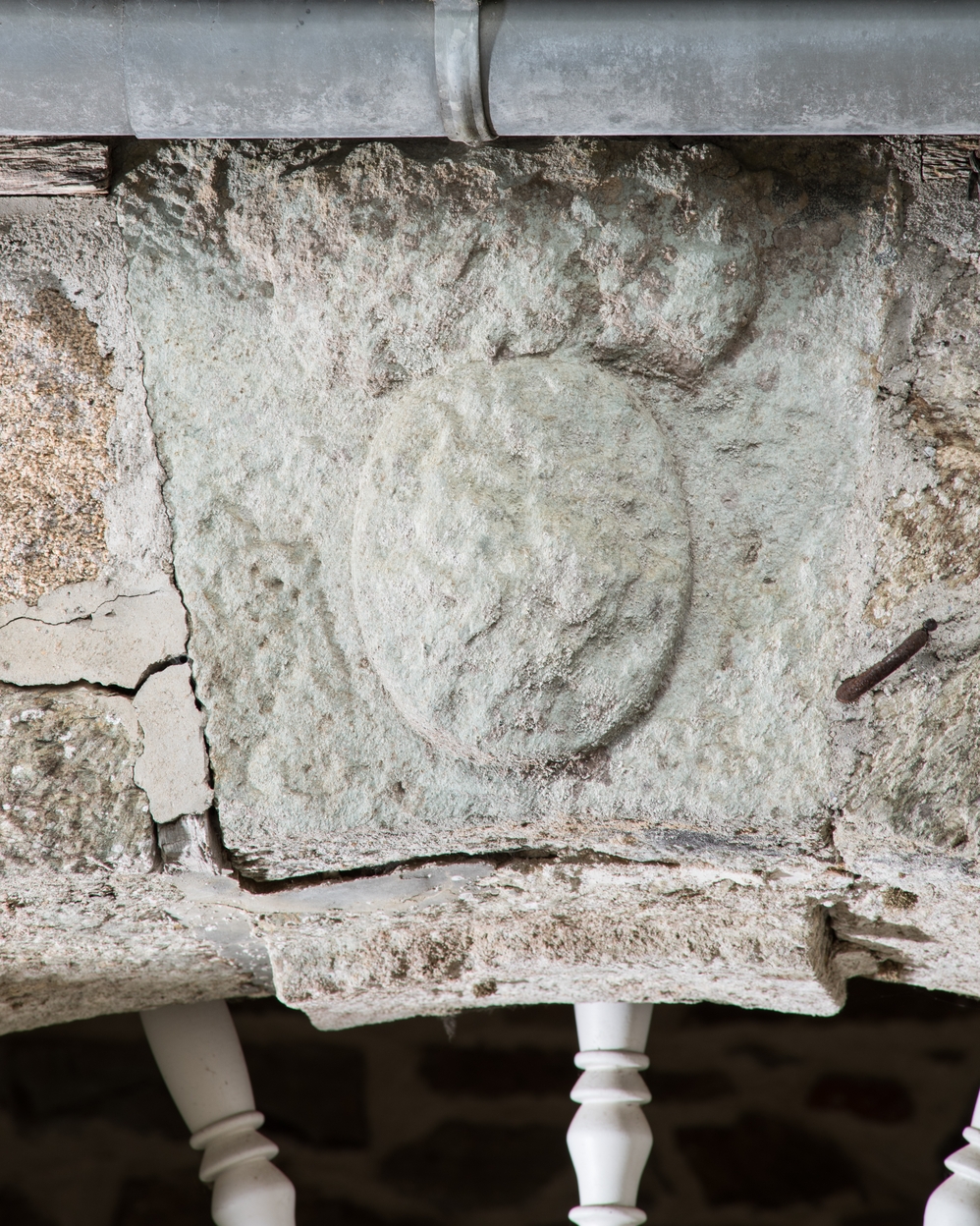L'église. Façade Sud. Détail du blason bûché au-dessus du porche d'entréeImmatriculation