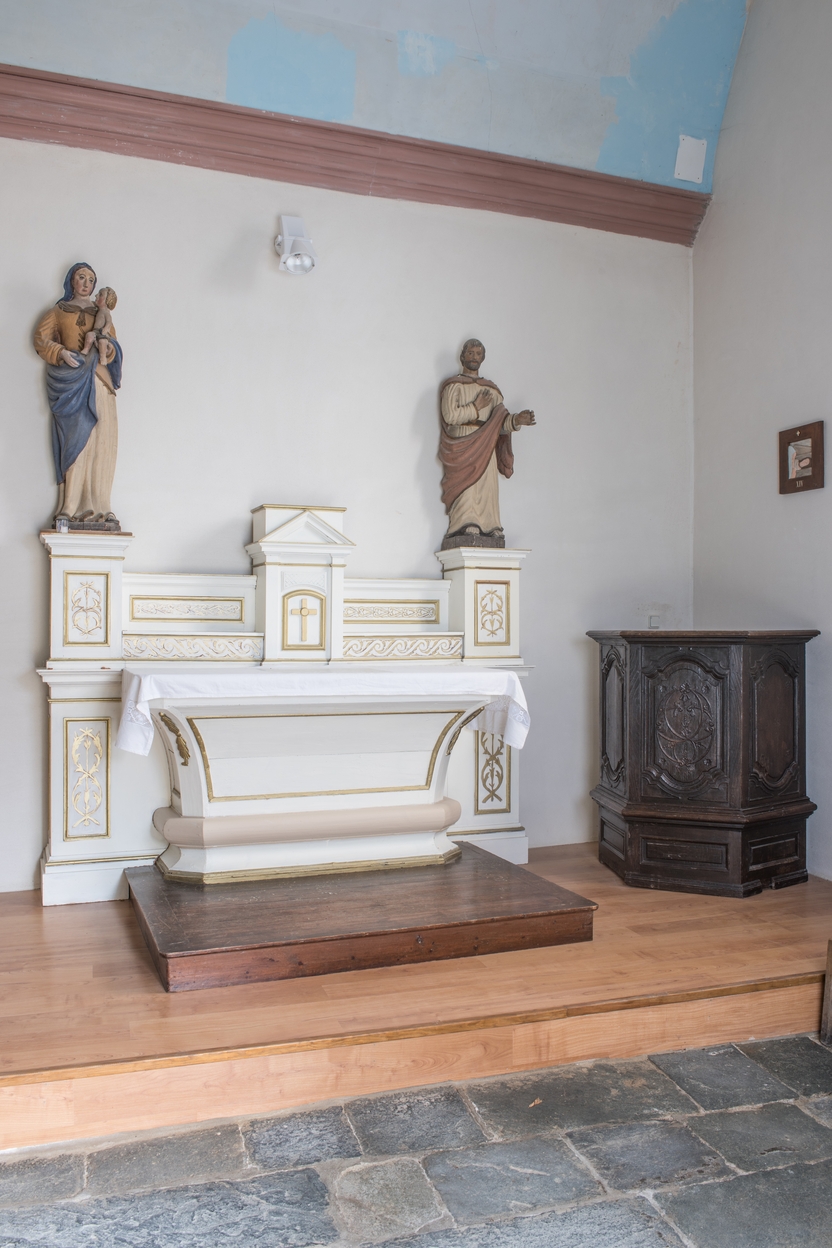 Bras Sud du transept. Chaire à prêcher et autel surmonté de deux statues en bois polychrome de Saint Joseph et de la Vierge à l'enfant, 16e siècleImmatriculation