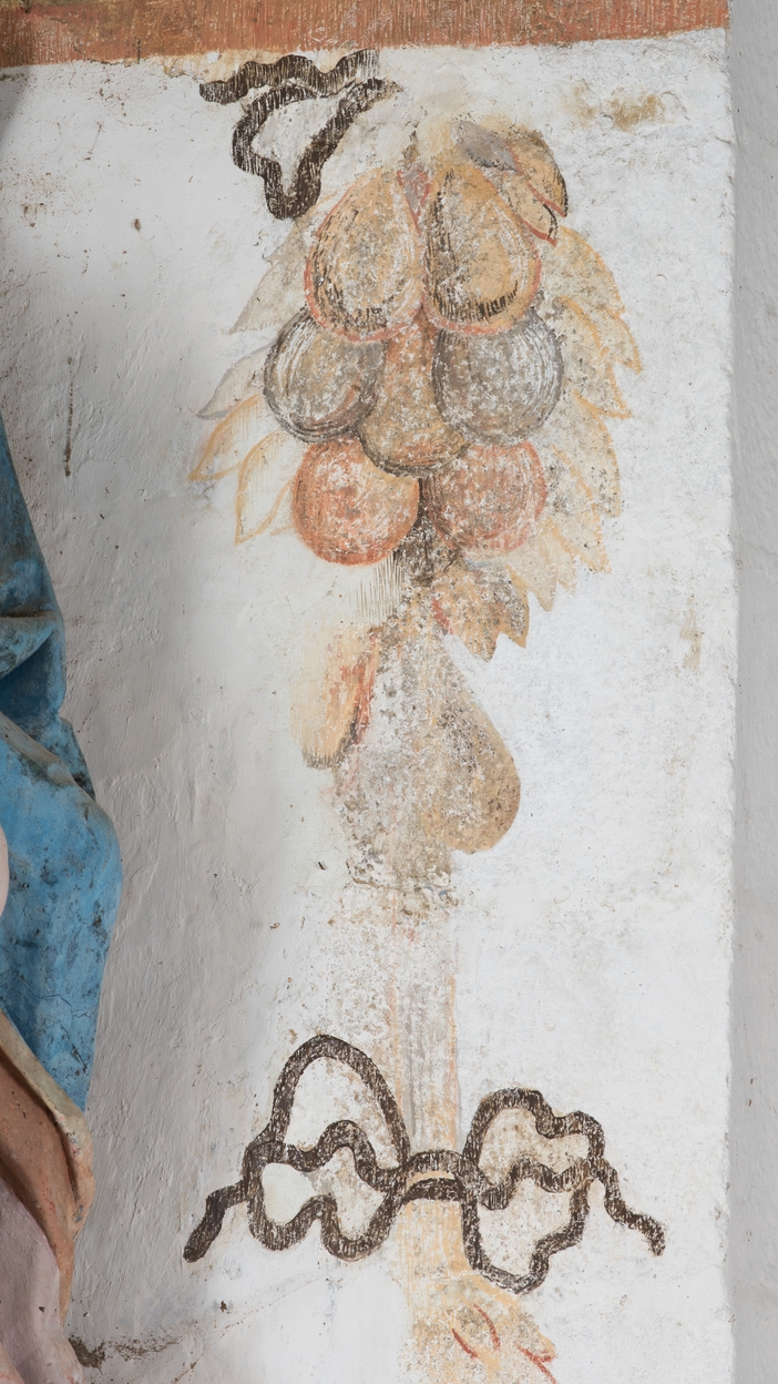 Chapelle. Mur du choeur. Détail d'une peinture murale : chute de fruitsImmatriculation