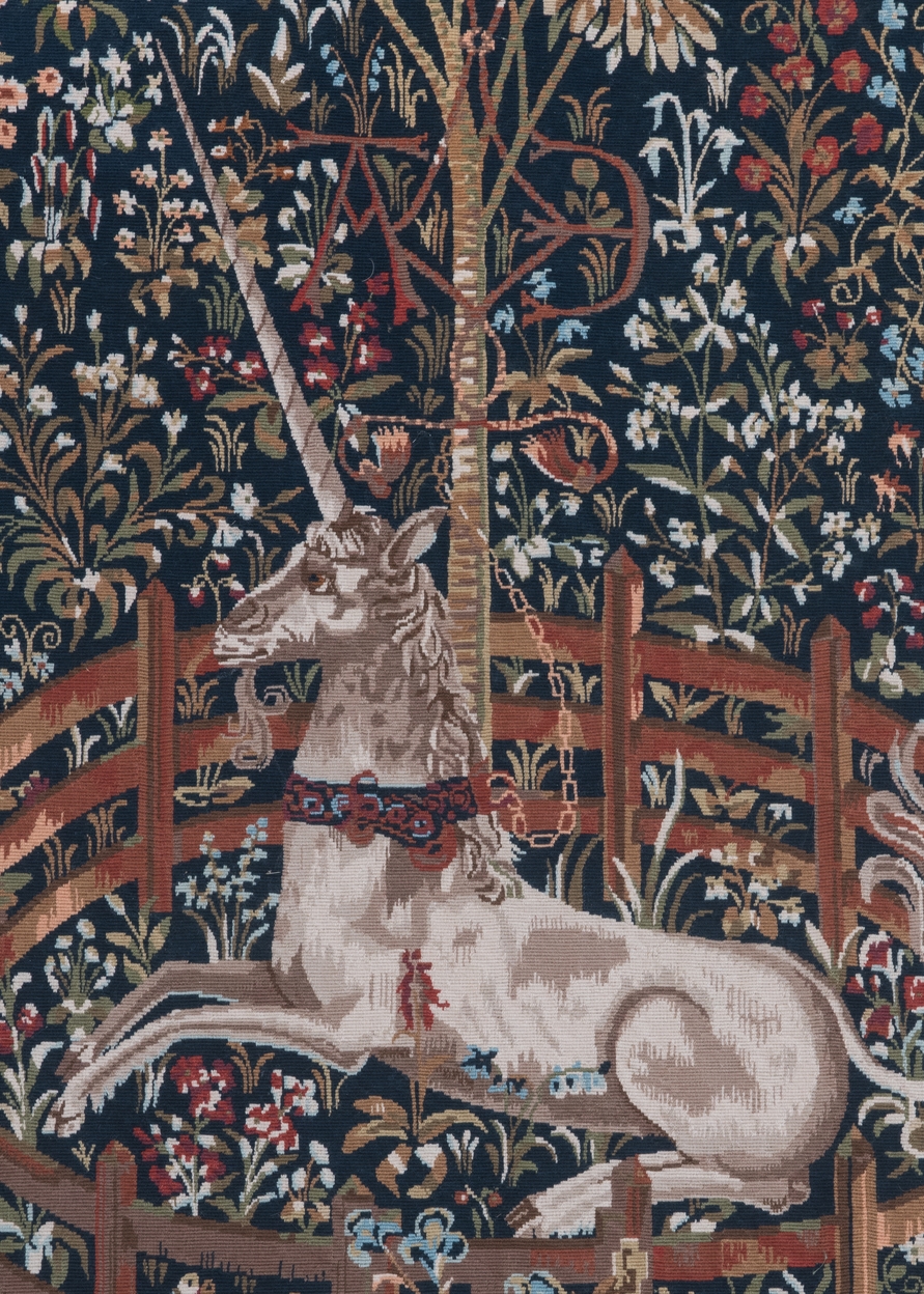 Chapelle. Tapisserie moderne (reproduction de la dame à la licorne). DétailImmatriculation