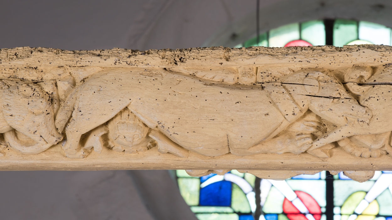 Entrait sculpté : chien de chasse attaquant un cerf.Immatriculation