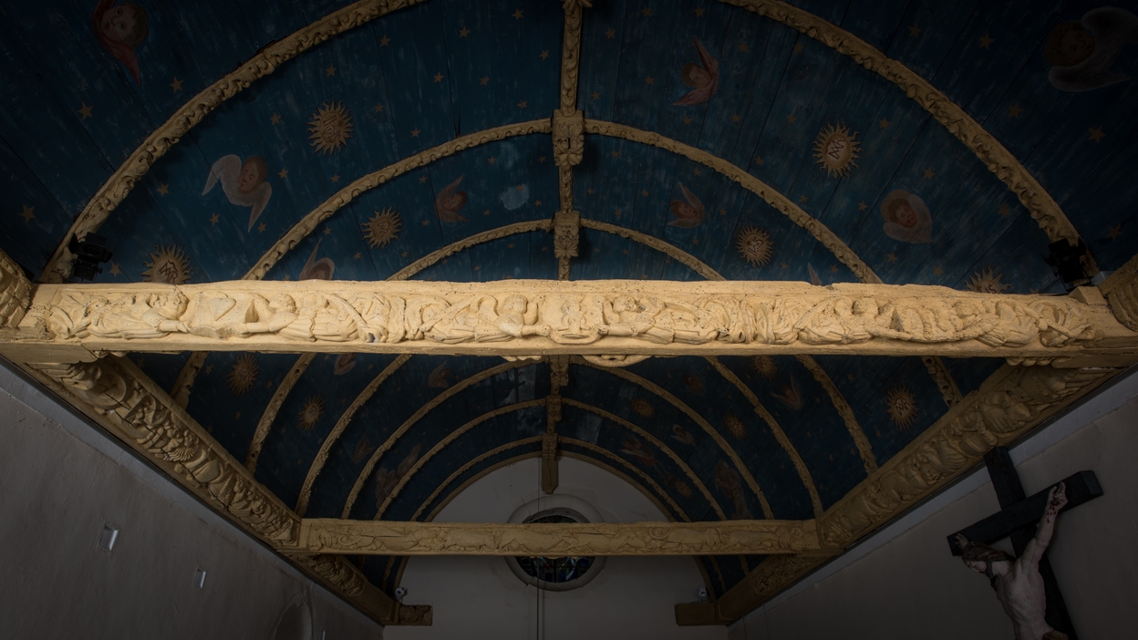 Charpente : vue générale avec la face est de l'entrait du choeur.Immatriculation