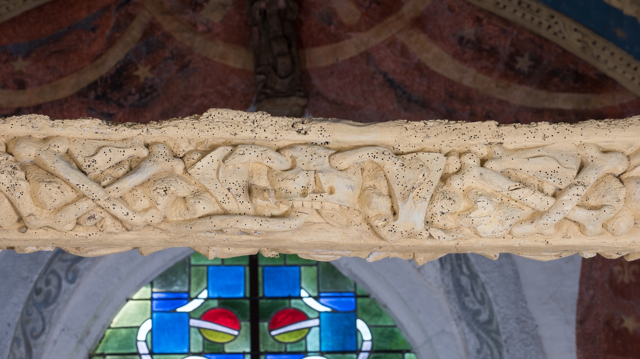 Face ouest de l'entrait du choeur : crâne et tibias croisés.Immatriculation