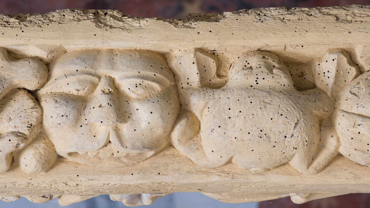 Face ouest de l'entrait du choeur : tête de monstre.Immatriculation