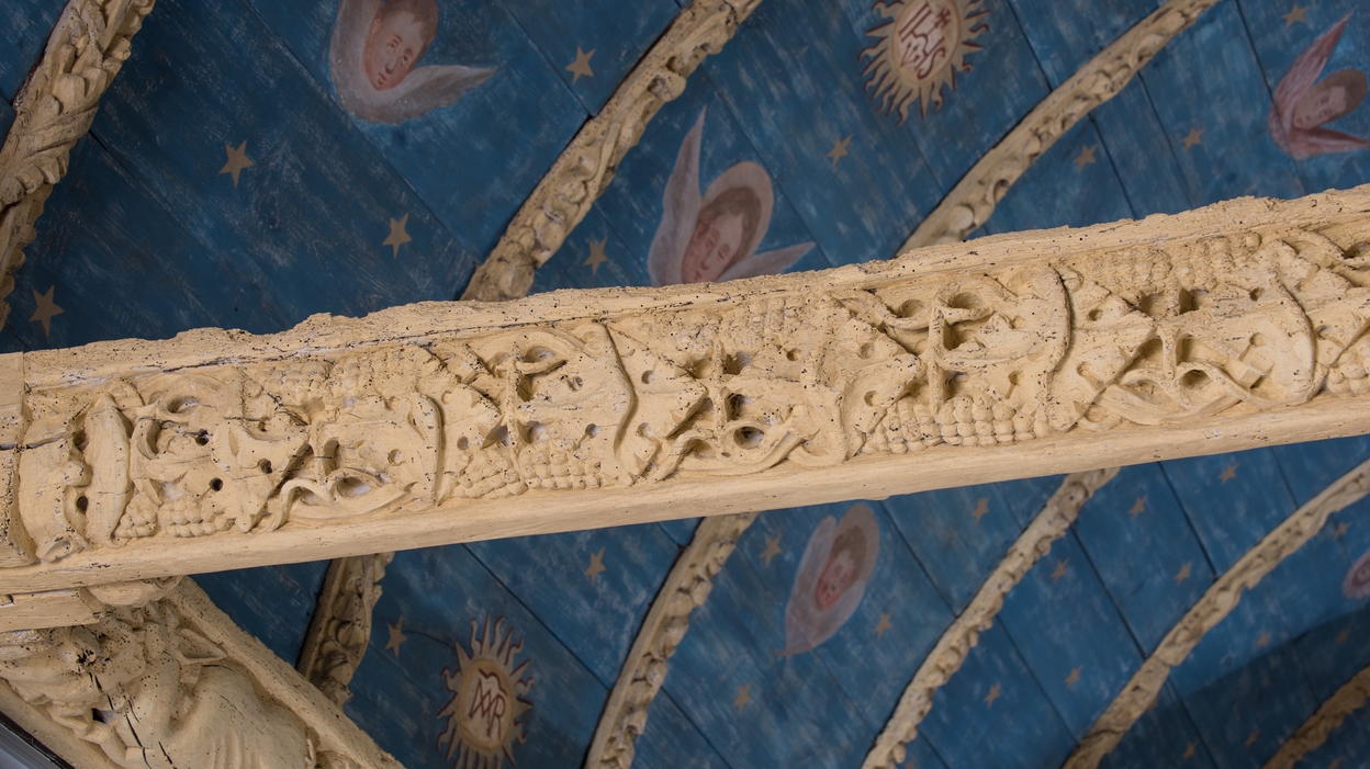 Face ouest de l'entrait de la nef : pampres de vigne.Immatriculation