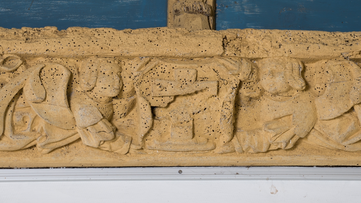 Sablière sud : instrument de la Passion, la Croix.Immatriculation