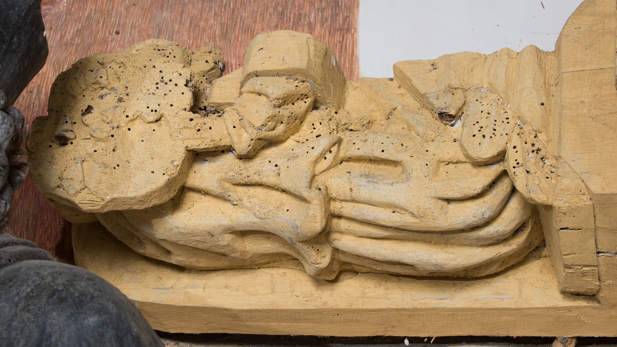 Sablières, blochet angle sud-est : ange tenant des armoiries.Immatriculation