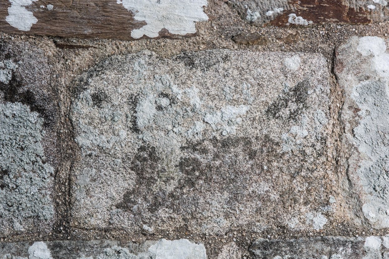 Chapelle. Détail d'une pierre de taille de graniteImmatriculation