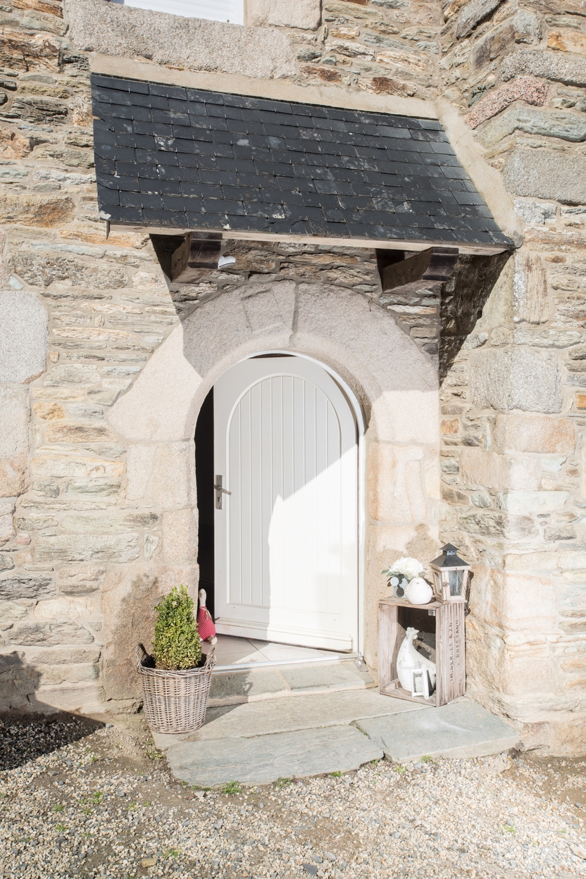 Façade Sud du presbytère, porte d'entrée à arc plein cintre surmontée d'un auventImmatriculation