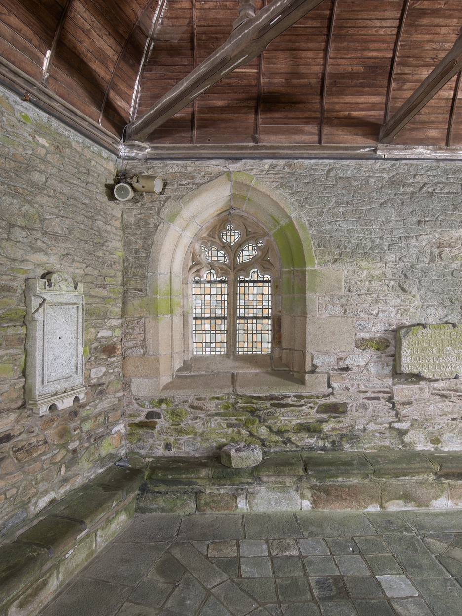 Tréguier : cloître de la cathédrale, intérieur de la galerie sud, baie à remplage gothique donnant sur la place du Martray et le haut de la Rue RenanImmatriculation