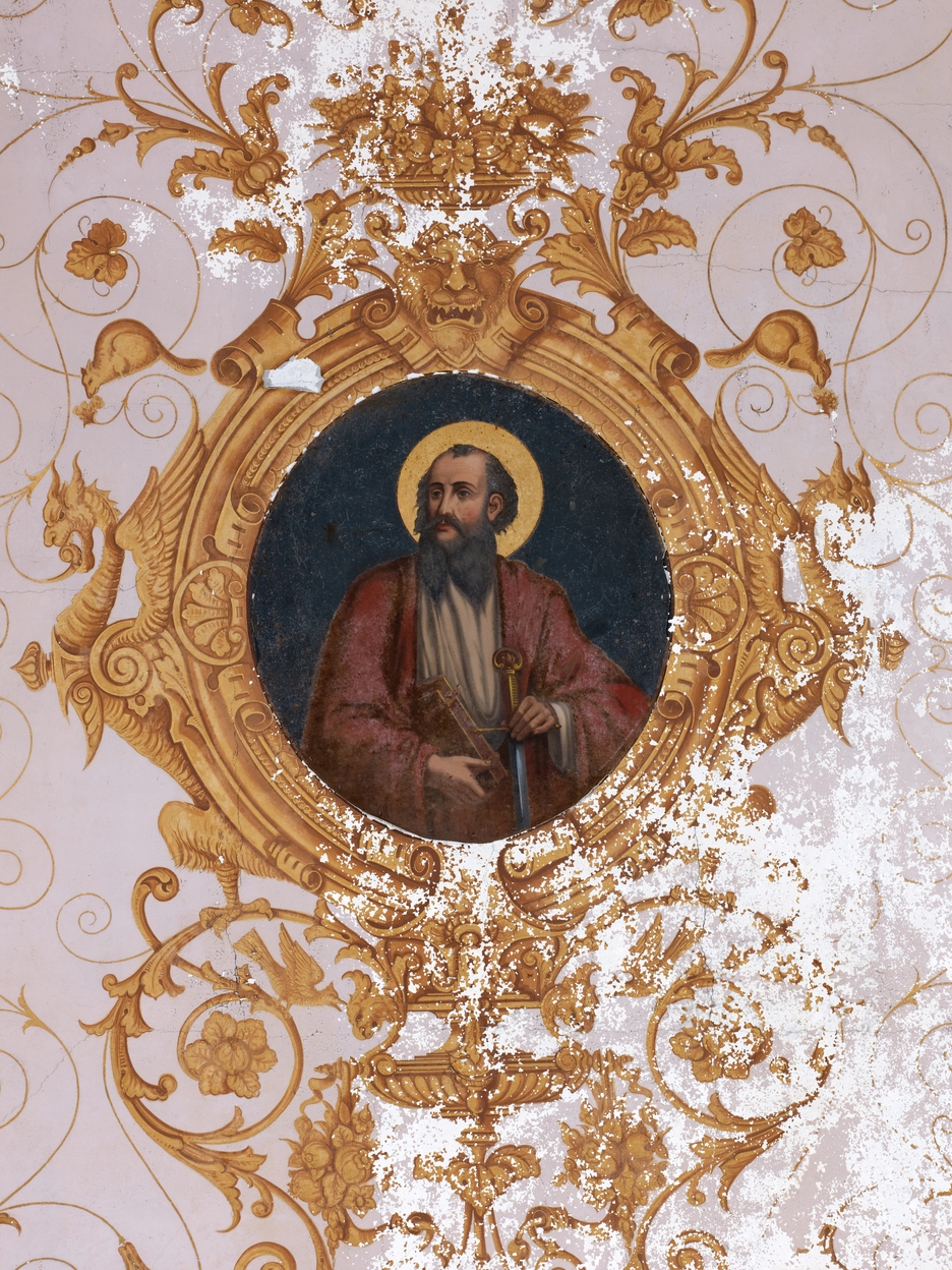 Nef des fidèles. Voûte. Détail d'un médaillon : saint Paul, daté 1871, signé J.HERLIDOImmatriculation