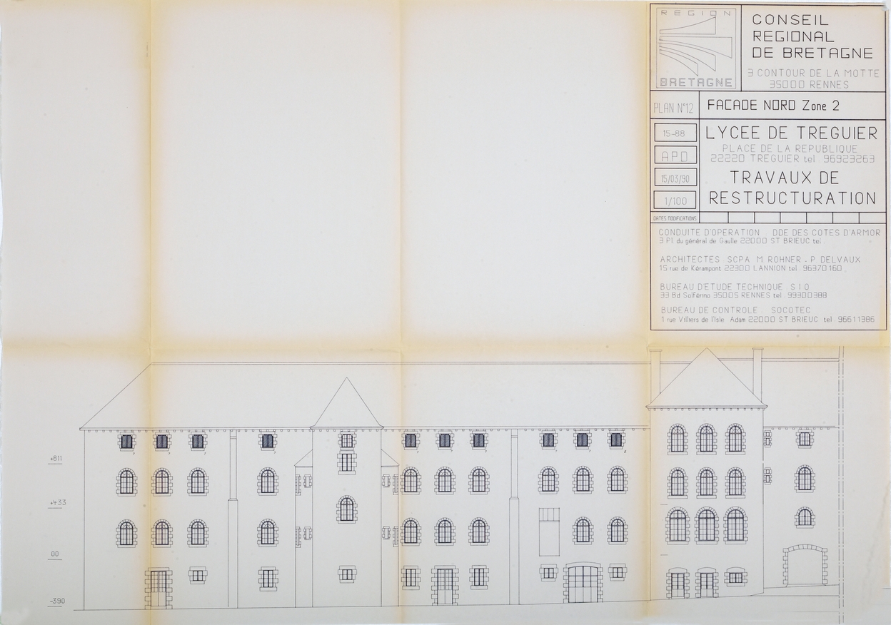 Tréguier : travaux de restructuration du lycée, zone 2, élévation nord (plan n° 12), 15 mars 1990 (Architectes SCPA : M. Rohner et P. Delvaux)Immatriculation