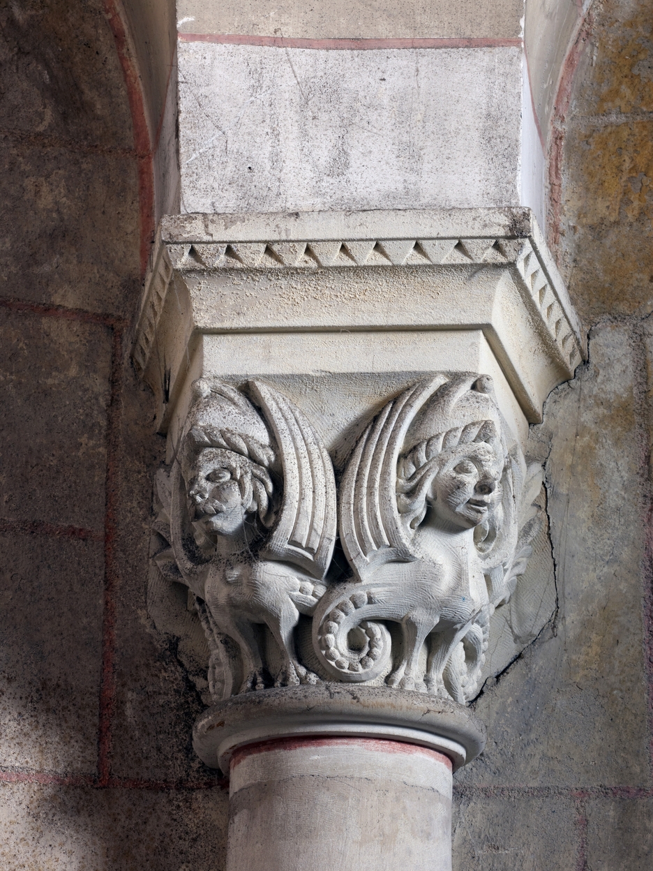 Tréguier, place de la République : chapelle du Petit Séminaire aujourd'hui Théâtre de l'Arche, détail de l'un des chapiteaux ornés de bas-reliefImmatriculation