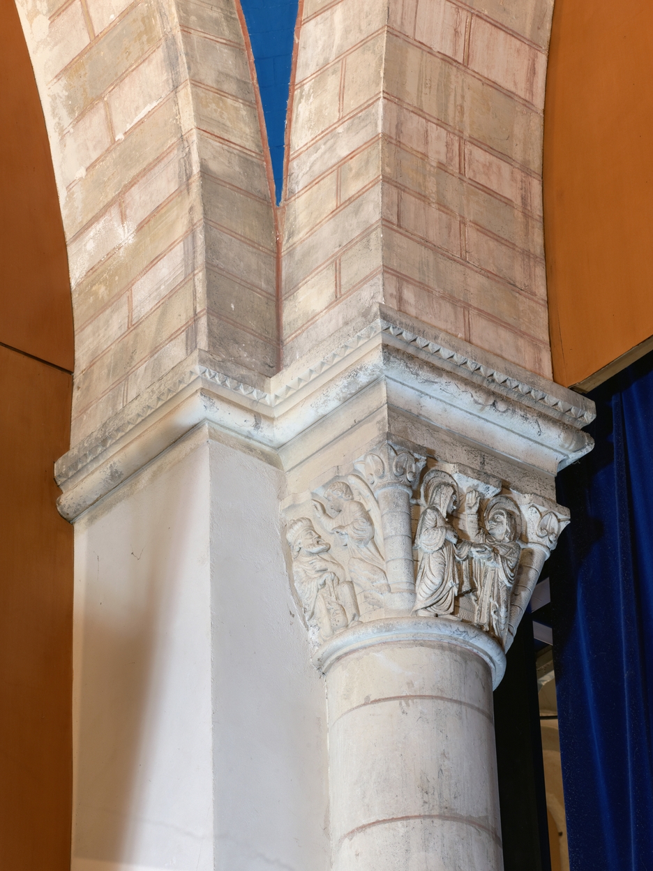 Tréguier, place de la République : chapelle du Petit Séminaire aujourd'hui Théâtre de l'Arche, détail de l'un des chapiteaux ornés de bas-reliefImmatriculation