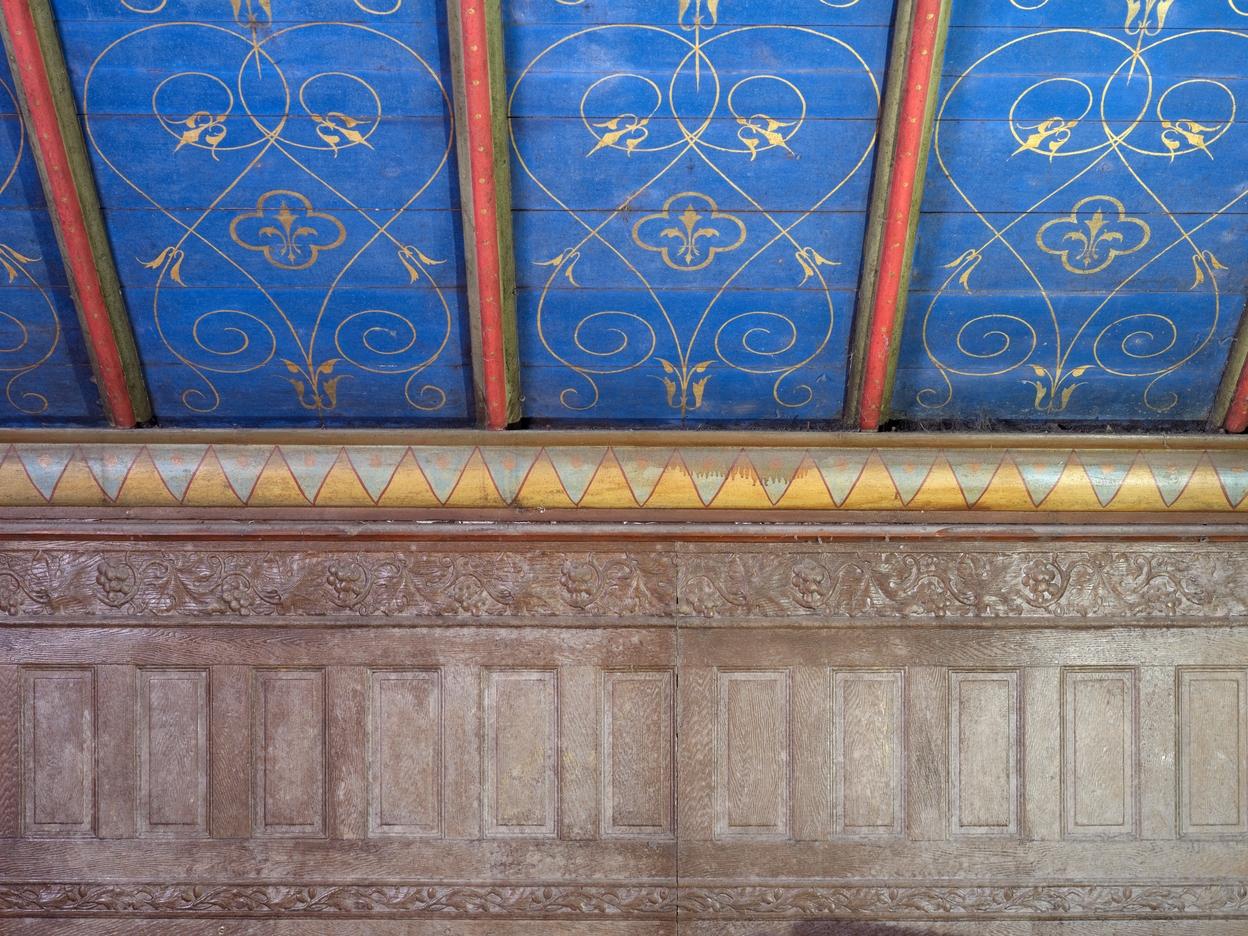Chapelle latérale. Détail du lambris de couvrement : décor de volutes peint à l'orImmatriculation