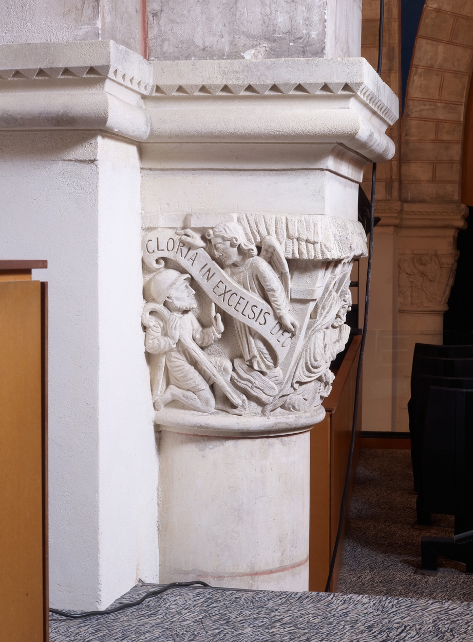 Tréguier, place de la République : chapelle du Petit Séminaire aujourd'hui Théâtre de l'Arche, détail de l'un des chapiteaux ornés de bas-reliefImmatriculation