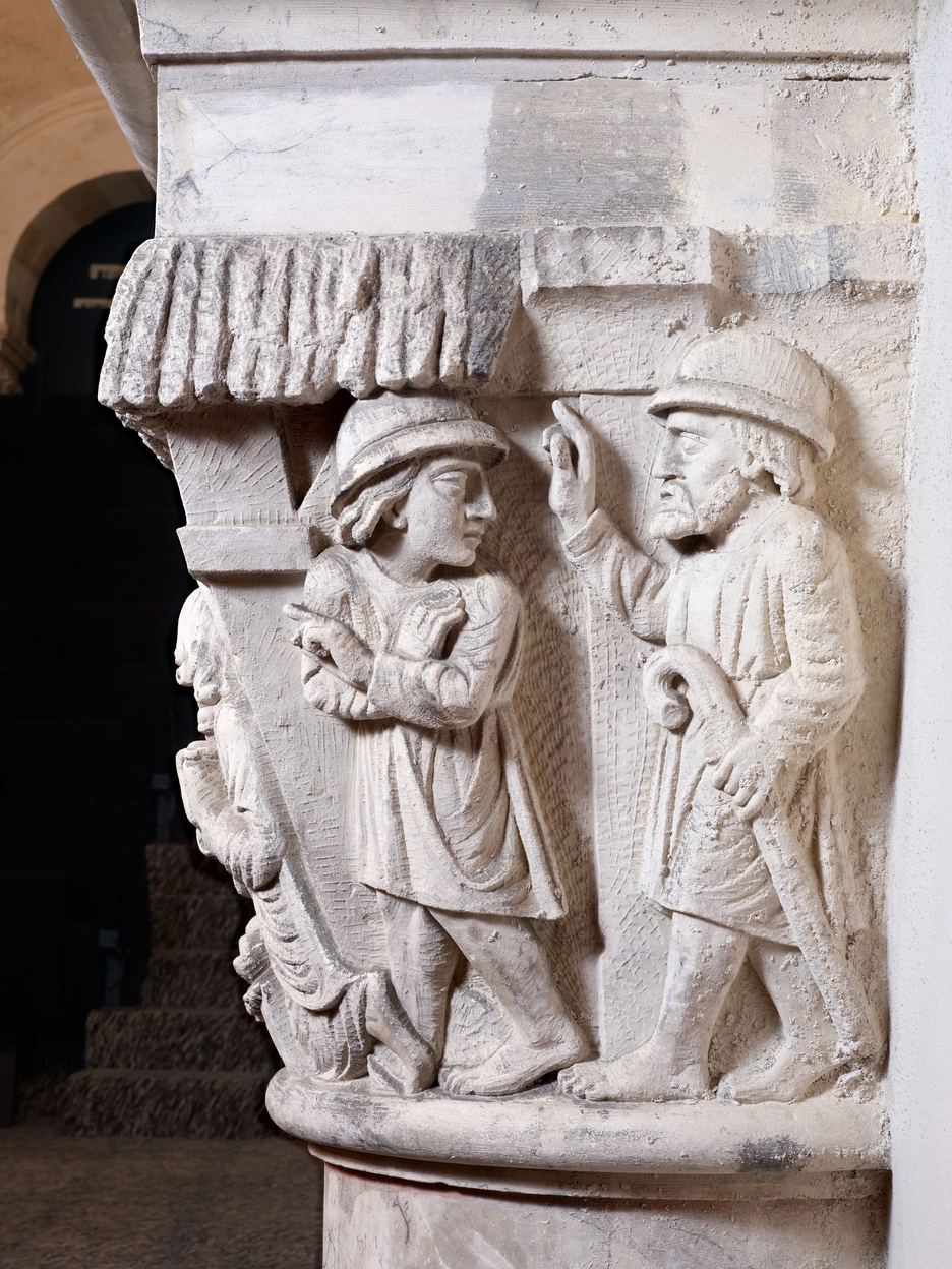 Tréguier, place de la République : chapelle du Petit Séminaire aujourd'hui Théâtre de l'Arche, détail de l'un des chapiteaux ornés de bas-reliefImmatriculation