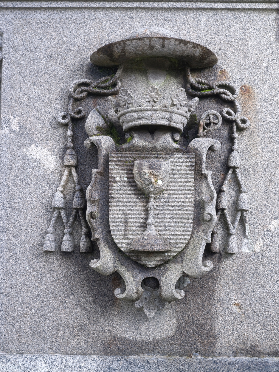 Tréguier, rue Marcellin Berthelot - Parc de la Baronnais : calvaire de Réparation, détail des armoiries de l'évêque de Saint-Brieuc et Tréguier, monseigneur FallièresImmatriculation