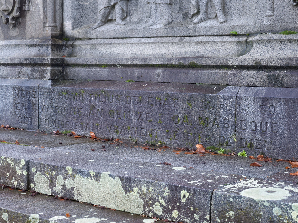 Tréguier, rue Marcellin Berthelot - Parc de la Baronnais : calvaire de Réparation, détail du socle. On peut lire, en latin, en breton et en français, en réponse à Ernest Renan, la parole du centurion romain (saint Longin) au pied de la croix, rapportée par les évangiles : "Cet homme était vraiment le fils de Dieu"Immatriculation