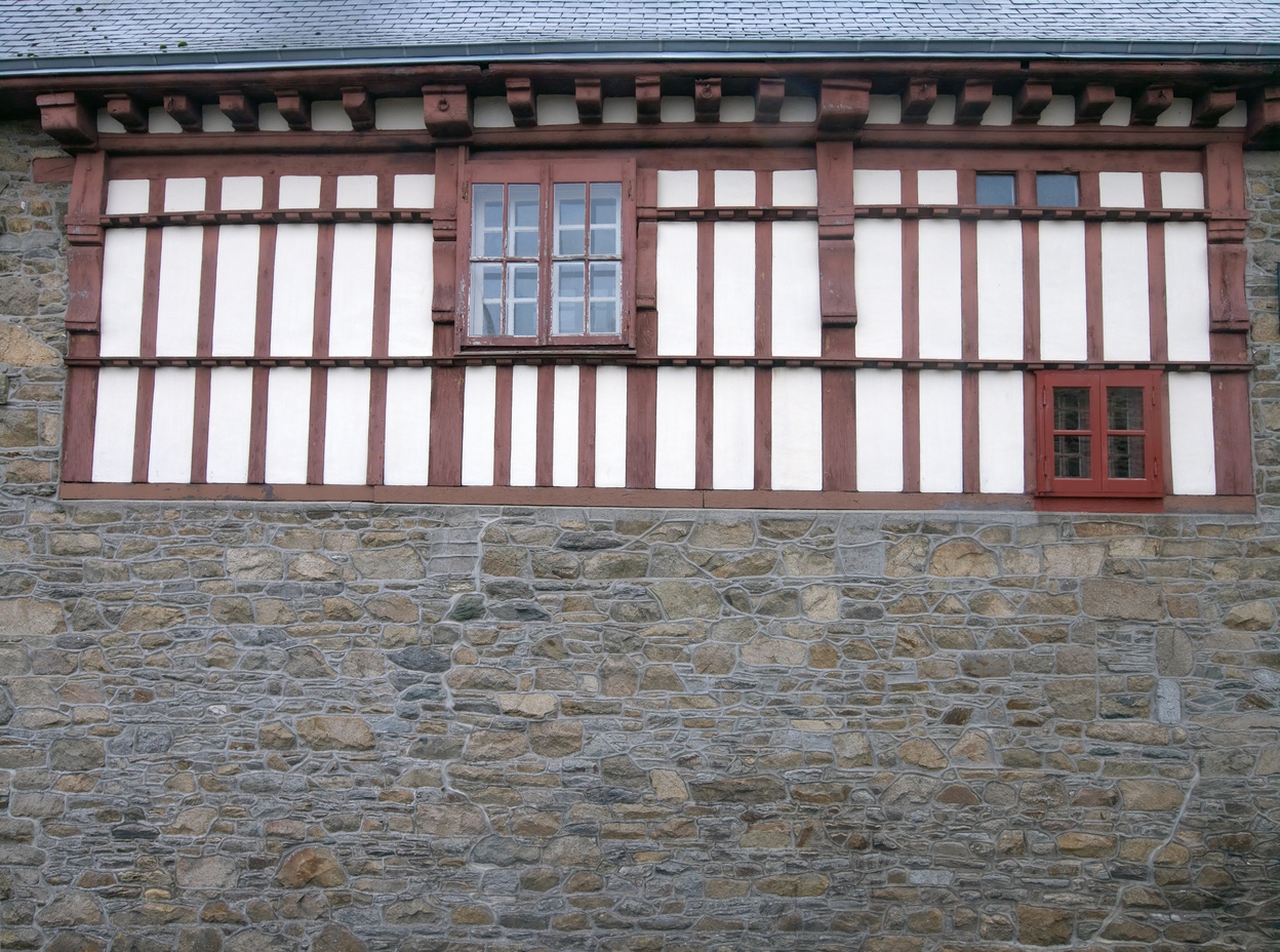 Façade nord. Détail du pan de bois avec petites fenêtres en décalé correspondant à la montée de l'escalier primitif