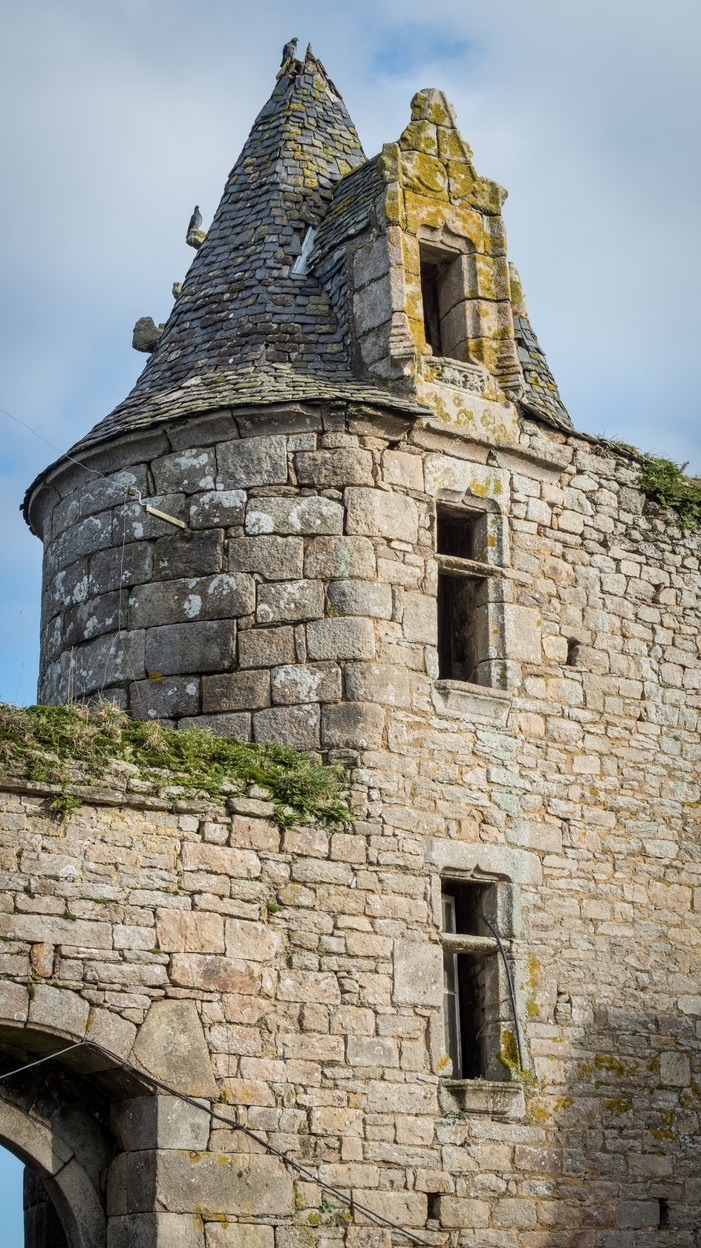 Trémel : manoir de Kermerzit, détail de la tour. Il est probable que cette tour ait pu servir de logement à un chapelain affecté à l'office de la chapelle seigneurialeImmatriculation