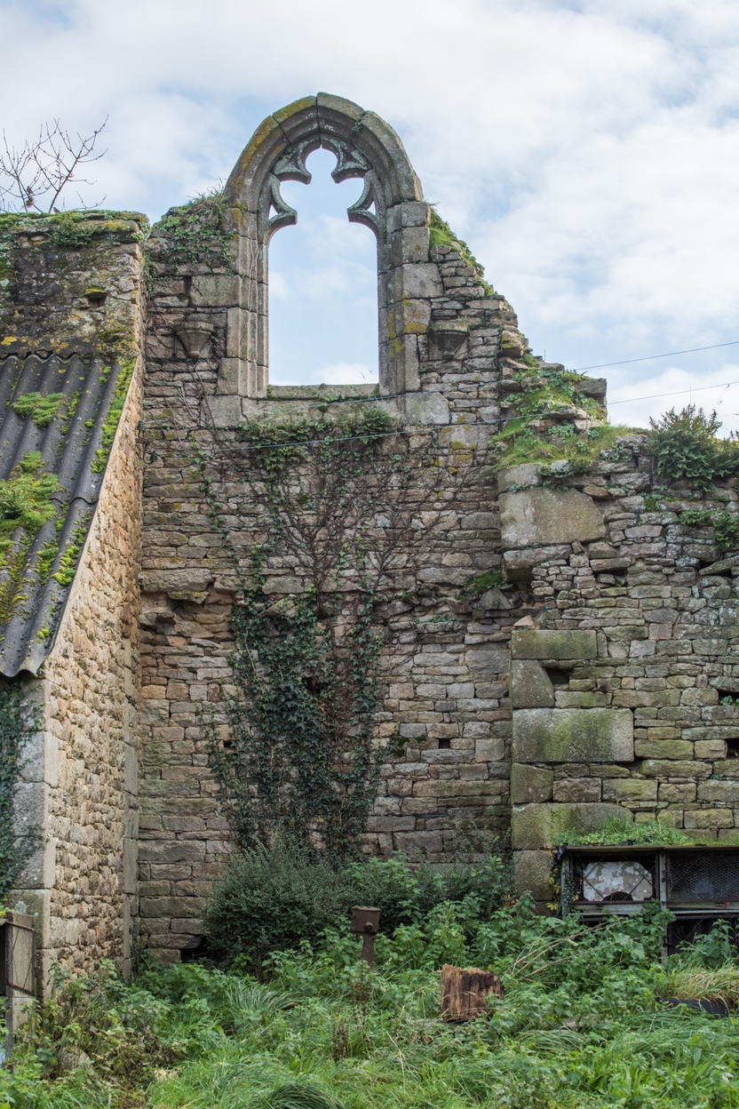 Trémel : manoir haut de Kermerzit, emplacement de la galerie sur arcades et de la chapelle ou oratoire. La galerie - aujourd'hui totalement détruite, menait du logis principal à la tour au nord : elle desservait la chapelle dont on peut encore voir une magnifique fenêtre en arc brisé et une partie de son remplage orientée vers l'estImmatriculation