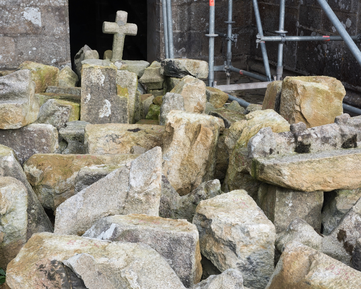 Trémel, le bourg : église paroissiale Notre-Dame, vue extérieure, détail du dépôt de pierre de taille (après l'incendie du 21 juin 2016)Immatriculation