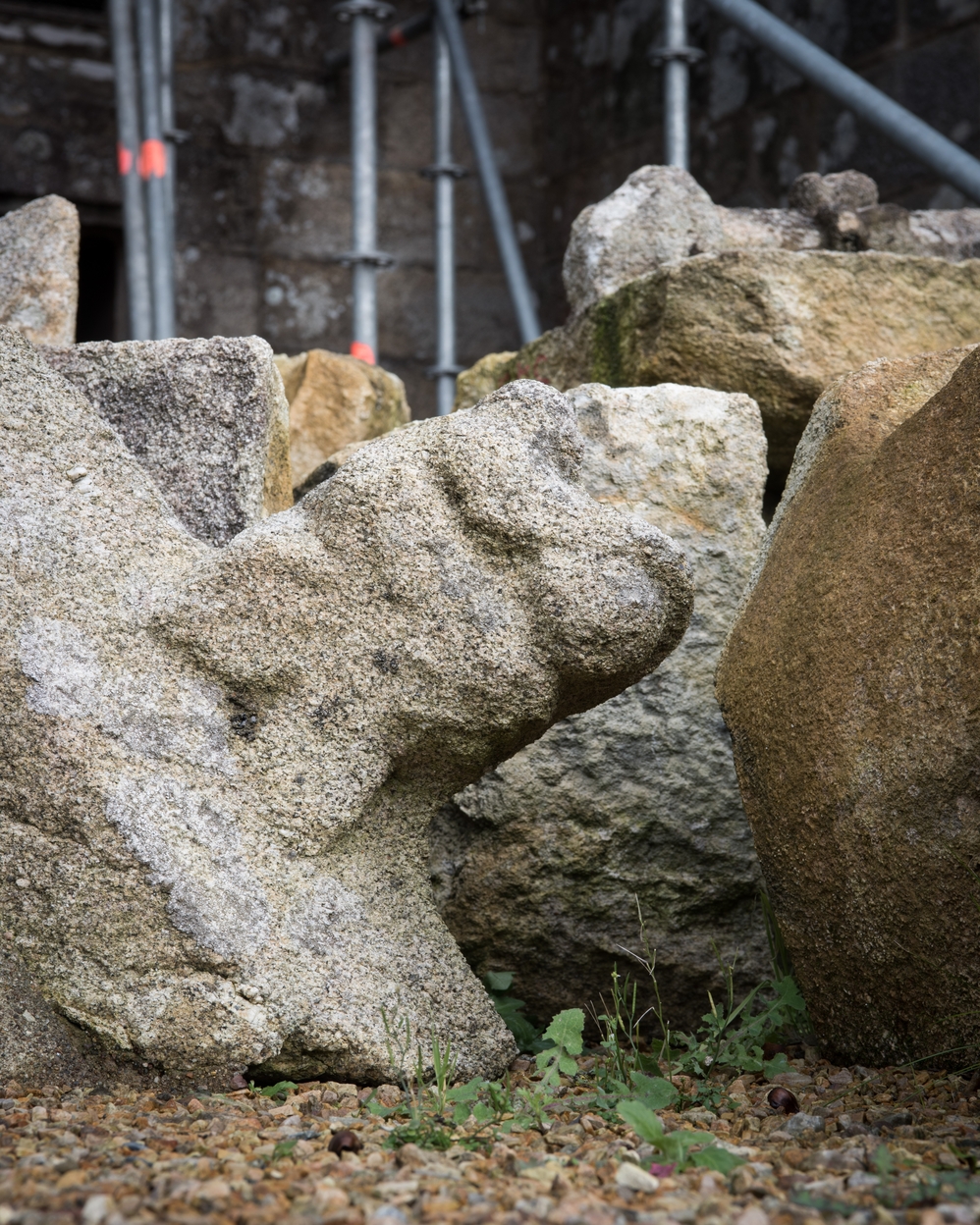 Trémel, le bourg : église paroissiale Notre-Dame, vue extérieure, détail du dépôt de pierre de taille (après l'incendie du 21 juin 2016)Immatriculation