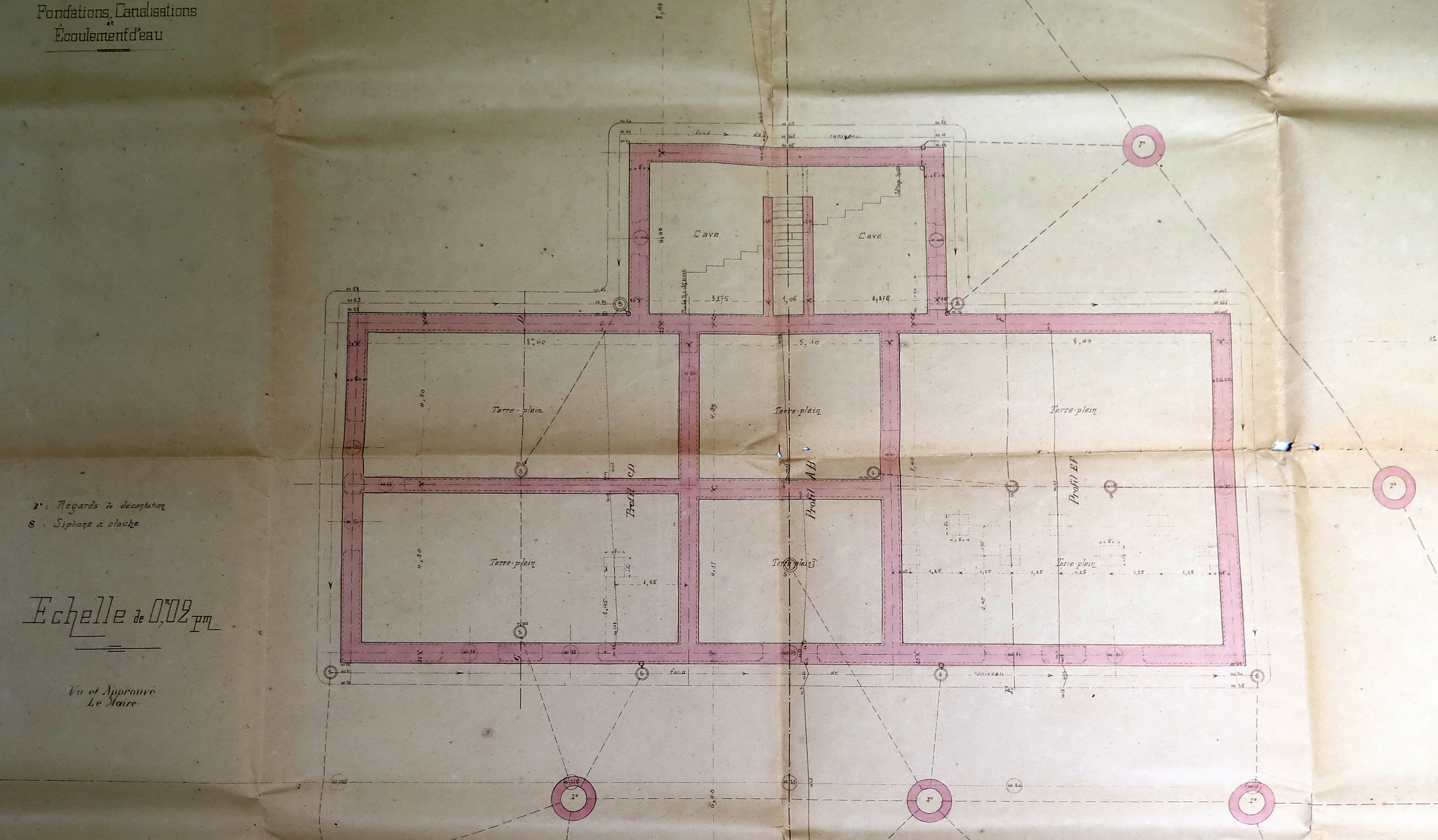 Tréguier, rue du Guindy : détail du plan de nivellement, fondations, canalisations, écoulement d'eau de l'abattoir de la ville de Tréguier, 2 mai 1908 (Archives municipales de Tréguier, 1M9)Immatriculation